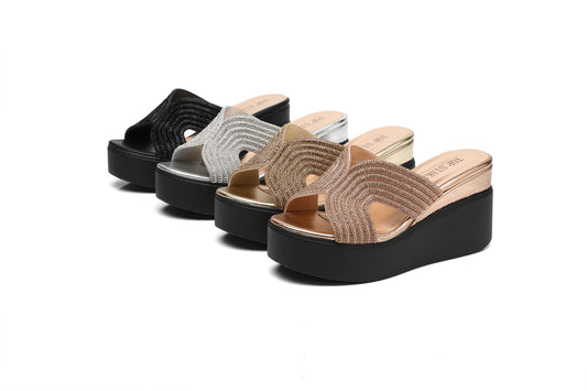 IVACHY Women’s Platform Wedge Sandals, Rhinestone sparkling Open Toe Slip On Mules, Lightweight chunky Sole Comfort Summer Slippers for Holiday, Party & Casual Wear A68606